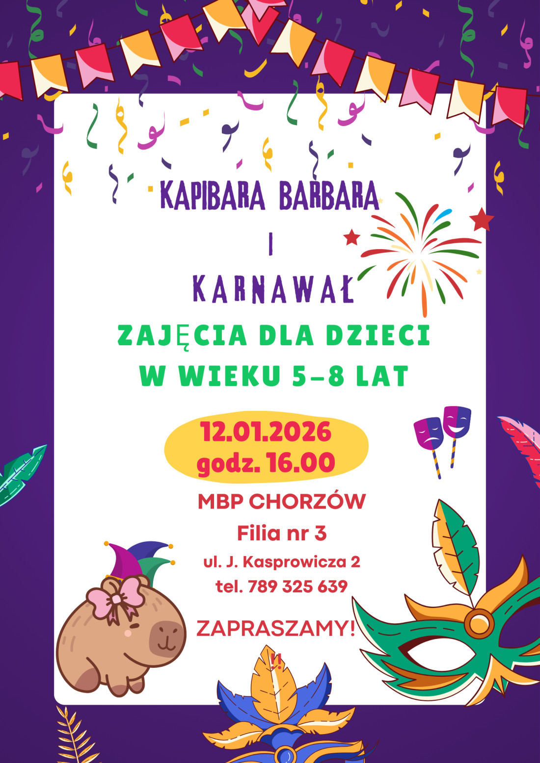 Serdecznie zapraszamy na zajęcia literacko-plastczne pt. " Karnawał z Kapibarą Barbarą", zajęcia dla dzieci w wieku 5-8 lat. Informacje pod nr tel. 789 325 639.